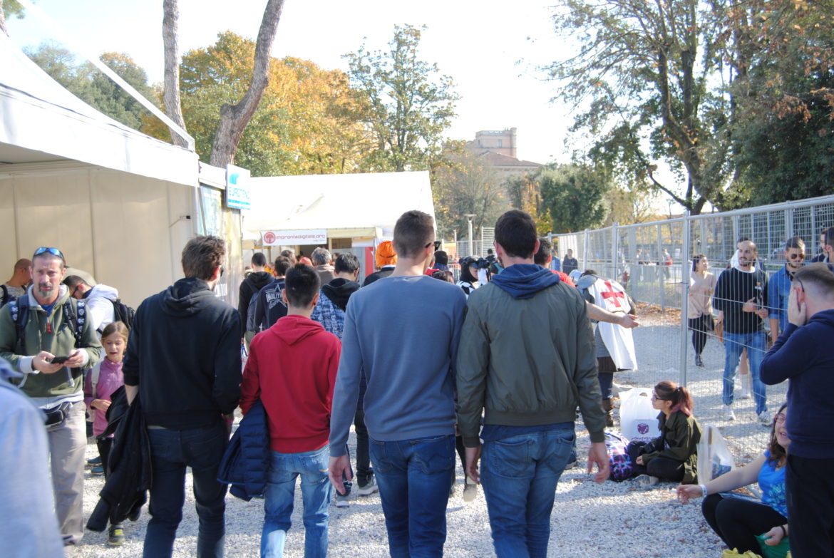 Una volta passati gli Appennini le due orette di macchina che ci avanzano passano in fretta e alle 09:45 circa siamo a Lucca. La rugiada bagna ancora l’erba che circonda il nostro parcheggio, ma nella cittadina c’è già un notevole movimento: gruppi di persone si avvicinano alla spicciolata alle biglietterie sparse al di fuori delle mura. Spunta la prima di innumerevoli Harley Quinn in shorts inguinali e mazza da baseball. Dopo esserci persi perché Krez conosce la strada (due volte) riusciamo ad incastrarci nella coda giusta per entrare nella cittadella ed essendo l’unico con uno zaino vengo giustamente perquisito da un esponente del corpo forestale dello stato tra le amene risate dei miei compagni di viaggio.